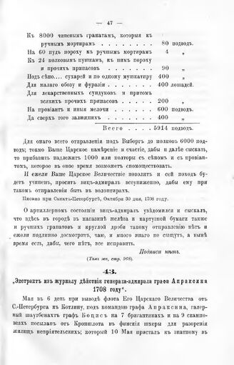 Письма адмирала Апраксина к Государю Петру I. Экстракт из журналу действия генерала-адмирала графа Апраксина 1708 году