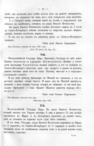 Письма Тихона Стрешнева к Государю Петру I. Из Москвы, августа 4-го дня. [1709] г. // Каб. дела, Отд. II, кн. 10, стр. 116.