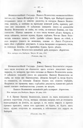 Письма адмирала Апраксина к Государю Петру I. Из лагеря от Выборха. Марта 26 дня, 1710 г. // Каб. дела, Отд. II, кн. 11, стр. 72.