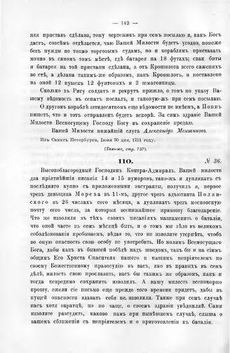 Письма Князя Меншикова к Государю Петру I. № 36. Из Санкт Питербурха, июля 31 дня, 1711 году // Каб. дела, Отд. II, книга 13, стр. 753.