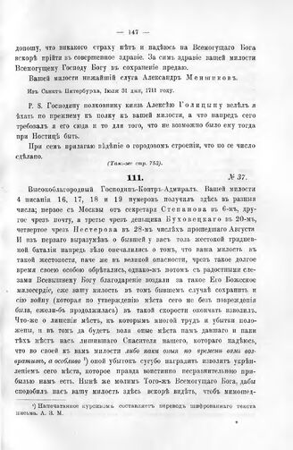 Письма Князя Меншикова к Государю Петру I. № 37. Из Санкт-Петербурха, сентября 2 дня, 1711 году // Каб. дела, Отд. II, книга 13, стр. 749.
