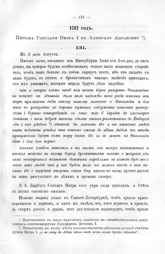 Письма Государя Петра I к Адмиралу Апраксину. Августа 2-го дня, 1712-го году, из Грибсвальда // Каб. дела, Отд. I, кн. 31, стр. 151.