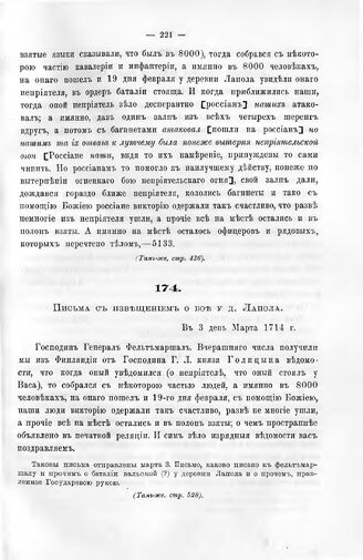 Письма с извещением о бое у д. Лапола. В 3 день марта 1714 г. // Каб. дела, Отд. I, кн. 21., стр. 528.