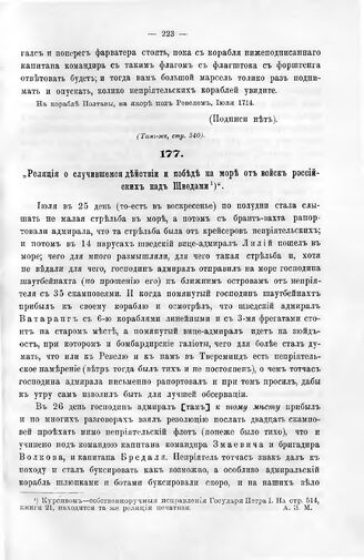 Реляция о случившемся действии и победе на море от войск российских над шведами. Июля в 25 день 1714 г. // Каб. дела, Отд. I, кн. 21., стр. 546.