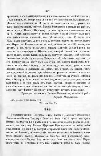 Письма Кириллы Нарышкина к Государю Петру I. Дня 7-го июня, Нарва, 1714 г. // Каб. дела, Отд. II, кн. 21, стр. 14.