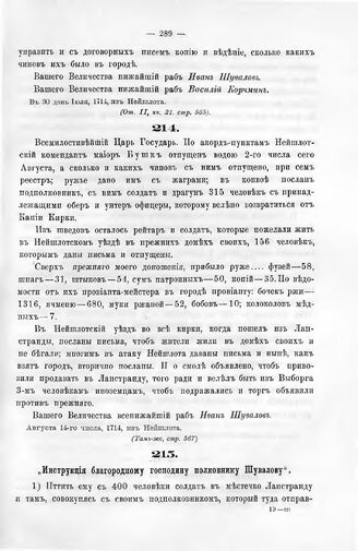 Инструкция благородному господину полковнику Шувалову. Дано в Санкт-Петербурге. Мая 21 дня, 1714 году // Каб. дела, Отд. II, кн. 21. стр. 570.