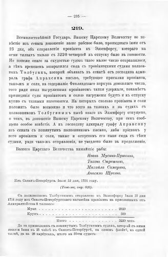 Письмо Ивана Мусина-Пушкина, Тихона Стрешнева, Михаила Самарина, Анисима Щукина Государю Петру I. Из Санкт-Петербурга. Июля 12 дня, 1714 году // Каб. дела, Отд. II, кн. 21, стр. 810, 812.