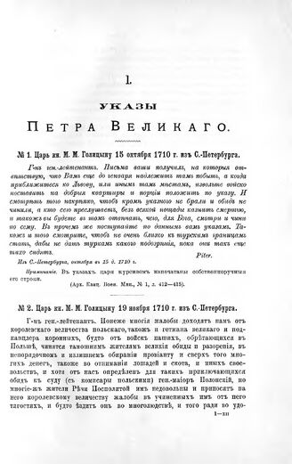 Указы Петра Великого. Царь кн. М.М. Голицыну 19 ноября 1710 г. из С.-Петербурга // Арх. Канц. Воен. Мин., № 1, л. 417 и 418.