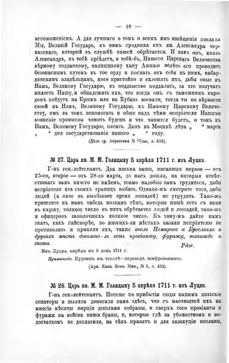 Указы Петра Великого. Царь кн. М.М. Голицыну 5 апреля 1711 г. из Луцка // Арх. Канц. Воен. Мин., № 1, л. 433.