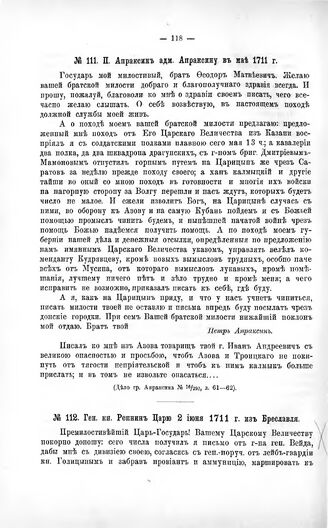 Переписка участников войны. Ген. кн. Репнин Царю 2 июня 1711 г. из Бреславля // Дела Каб., Отд. II, кн. 13, л. 843.