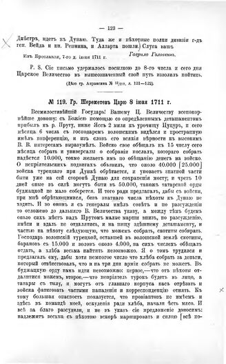 Переписка участников войны. Гр. Шереметев Царю 8 июня 1711 г. // Дело Шереметева, XX, № 405, ч. III.