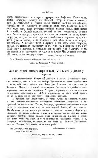 Переписка участников войны. Андрей Ушаков Царю 2 июля 1711 г. от р. Днепра у порогов // Дела Каб., Отд. II, кн. 13, л. 1008.