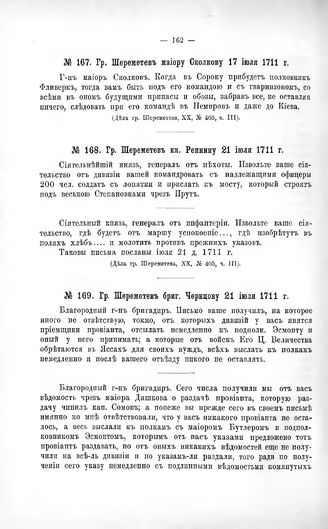 Переписка участников войны. Гр. Шереметев майору Сколкову 17 июля 1711 г. // Дела гр. Шереметева, XX, № 405, ч. III.