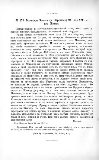 Переписка участников войны. Ген.-майор Эшков гр. Шереметеву 24 июля 1711 г. из Жванца // Дела гр. Шереметева, XX, № 405, ч. I.