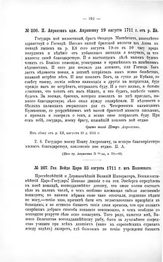 Переписка участников войны. Ген. Вейде Царю 23 августа 1711 г. из Полонного // Дела Каб., Отд. II, кн. 13, л. 275.