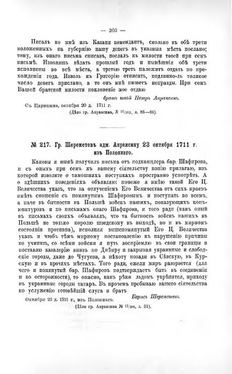 Переписка участников войны. Гр. Шереметев адм. Апраксину 23 октября 1711 г. из Полонного