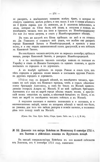 Донесение ген.-майора Вейсбаха кн. Меншикову 6 сентября 1711 г. из Золочева о действиях конницы в Прутском походе