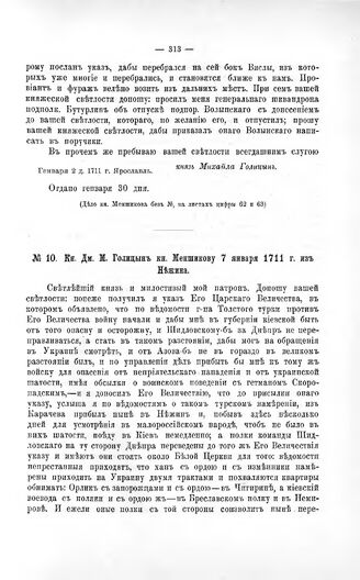 Переписка участников войны. Кн. Дм. М. Голицын кн. Меншикову 7 января 1711 г. из Нежина // Копии писем к кн. Меншикову № 10 (35).