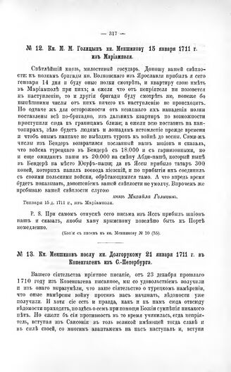 Переписка участников войны. Кн. М.М. Голицын кн. Меншикову 15 января 1711 г. из Мариамполя
