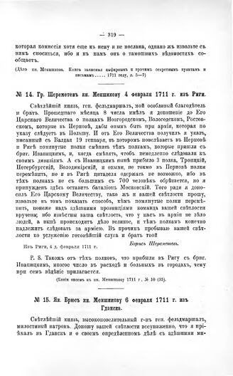 Переписка участников войны. Гр. Шереметев кн. Меншикову 4 Февраля 1711 г. из Риги
