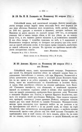 Переписка участников войны. Кн. М.М. Голицын кн. Меншикову 24 Февраля 1711 г. из Злочева