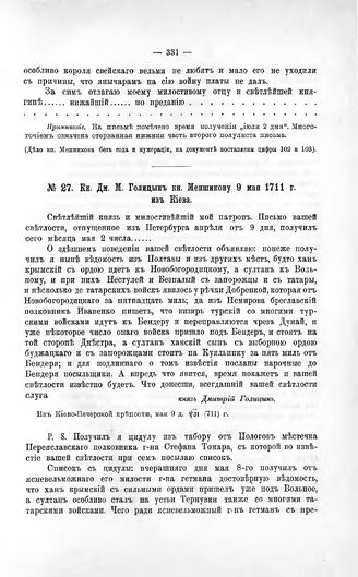 Переписка участников войны. Кн. Дм.М. Голицын кн. Меншикову 9 мая 1711 г. из Киева // Дело кн. Меншикова № 19, на листах цифры 353—356.