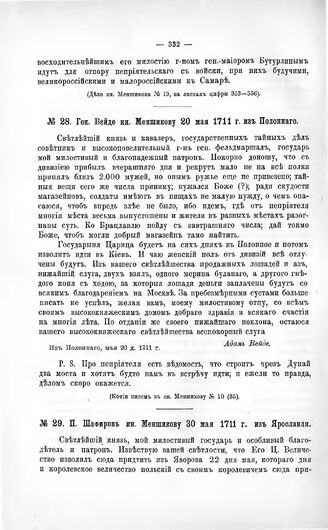 Переписка участников войны. Ген. Вейде кн. Меншикову 20 мая 1711 г. из Полонного