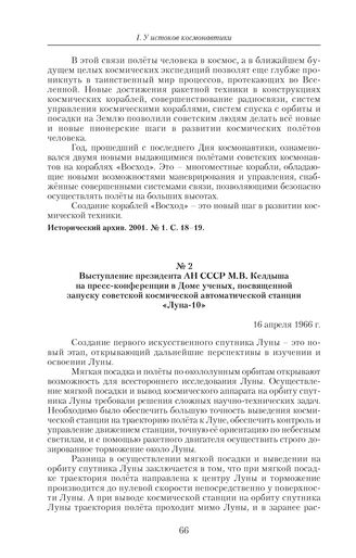 Выступление президента АН СССР М.В. Келдыша на пресс-конференции в Доме ученых, посвященной запуску советской космической автоматической станции «Луна-10». 16 апреля 1966 г. // Исторический архив. 2001. № 1. С. 20–21.