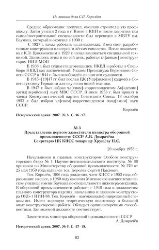 Представление первого заместителя министра оборонной промышленности СССР А.В. Домрачева Секретарю ЦК КПСС товарищу Хрущеву Н.С. 20 ноября 1953 г. // Исторический архив. 2007. № 6. С. 17–18.