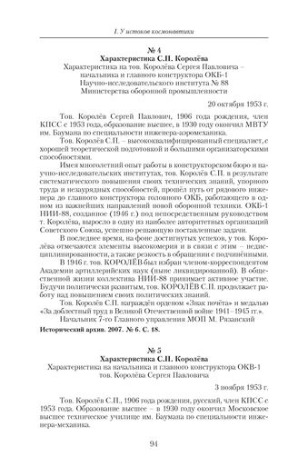 Характеристика на начальника и главного конструктора ОКВ-1 тов. Королева Сергея Павловича. 3 ноября 1953 г. // Исторический архив. 2007. № 6. С. 19.