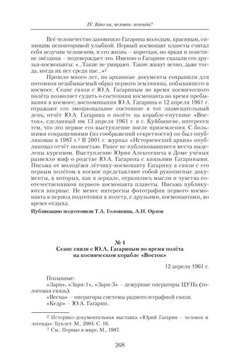 Сеанс связи с Ю.А. Гагариным во время полета на космическом корабле «Восток». 12 апреля 1961 г. // Исторический архив. 1998. № 5–6. С. 216–219.
