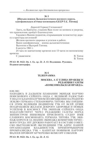 Письма и телеграммы в адреса редакций центральных газет в связи с полетом летчика-космонавта СССР Г.С. Титова в космос. Телеграмма экипажа научно-поискового сейнера Онда. 8.08.1961 г.