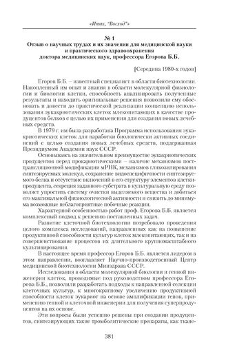 Отзыв о научных трудах и их значении для медицинской науки и практического здравоохранения доктора медицинских наук, профессора Егорова Б.Б. [Середина 1980-х годов]