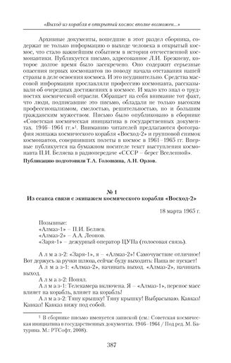 Из сеанса связи с экипажем космического корабля «Восход-2». 18 марта 1965 г. // Исторический архив. 2004. № 4. С. 98.