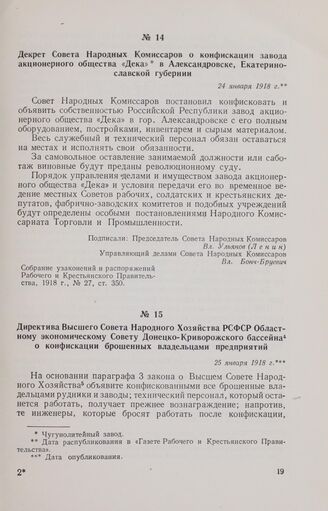 Декрет Совета Народных Комиссаров о конфискации завода акционерного общества «Дека» в Александровске, Екатеринославской губернии. 24 января 1918 г.