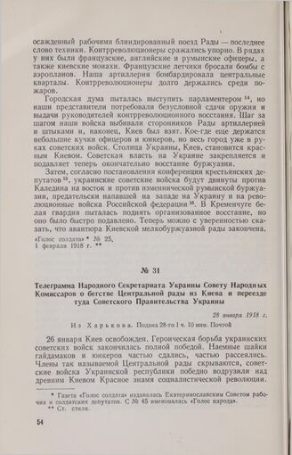 Телеграмма Народного Секретариата Украины Совету Народных Комиссаров о бегстве Центральной рады из Киева и переезде туда Советского Правительства Украины. 28 января 1918 г.