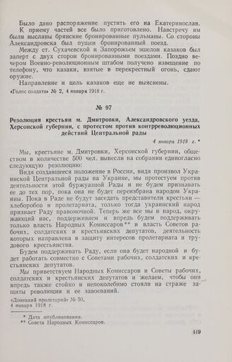 Резолюция крестьян м. Дмитровки, Александровского уезда, Херсонской губернии, с протестом против контрреволюционных действий Центральной рады. 4 января 1918 г.