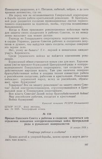 Призыв Одесского Совета к рабочим и солдатам сплотиться для отражения нападения контрреволюционных войск Центральной рады и румынских империалистов. 16 января 1918 г.