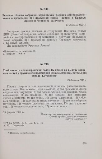Решение общего собрания харьковских рабочих деревообделочников о проведении при правлении союза записи в Красную Армию и Червоное казачество. 24 февраля 1918 г.
