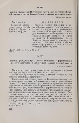 Решение Президиума ЦИК Советов Румчерода о формировании Червоного казачества и компетенции высшей военной власти. 26 февраля 1918 г.