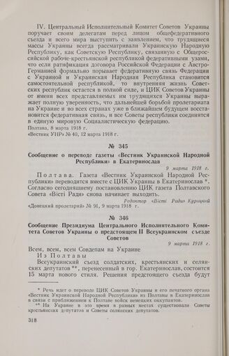 Сообщение о переводе газеты «Вестник Украинской Народной Республики» в Екатеринослав. 9 марта 1918 г. // «Донецкий пролетарий», № 91, 9 марта 1918 г.