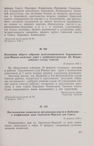 Резолюция общего собрания железнодорожников Харьковского узла Южных железных дорог с одобрением решения III Всероссийского съезда Советов. 18 февраля 1918 г.
