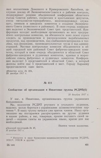 Сообщение об организации в Никитовке группы РСДРП(б). 30 декабря 1917 г. // «Донецкий пролетарий», № 47, 30 декабря 1917 г.