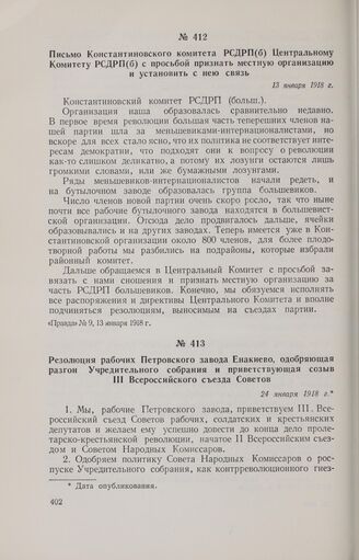 Письмо Константиновского комитета РСДРП(б) Центральному Комитету РСДРП(б) с просьбой признать местную организацию и установить с нею связь. 13 января 1918 г.