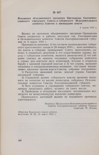 Резолюция объединенного заседания Президиума Екатеринославского городского Совета и губернского Исполнительного комитета Советов о ликвидации земств. 6 марта 1918 г.
