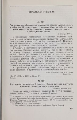 Постановление объединенного заседания президиумов городского и районных Исполнительных комитетов Советов рабочих депутатов Одессы об организации комиссии контроля, связи и агитационных секций. 16 декабря 1917 г.