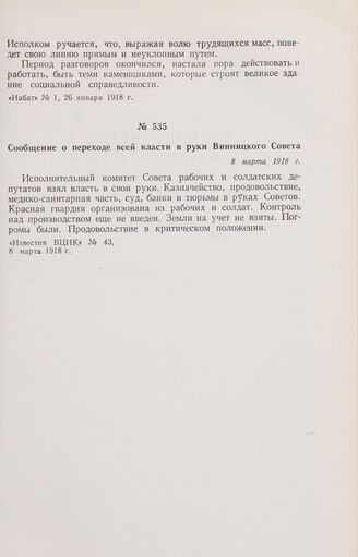 Сообщение о переходе всей власти в руки Винницкого Совета. 8 марта 1918 г. // «Известия ВЦИК», № 43, 8 марта 1918 г.