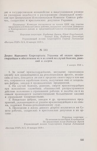 Декрет Народного Секретариата Украины об оплате красногвардейцам и обеспечении их и их семей на случай болезни, ранений и смерти. 2 января 1918 г.