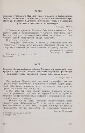 Решение общего собрания рабочих Харьковской городской типографии с протестом против контрреволюционной резолюции меньшевистского правления союза работников печати. 4 января 1918 г.