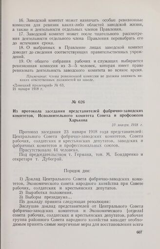 Из протокола заседания представителей фабрично-заводских комитетов, Исполнительного комитета Совета и профсоюзов Харькова. 23 января 1918 г.